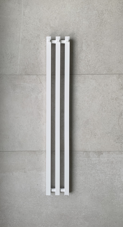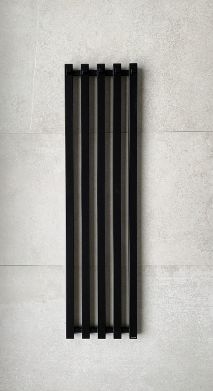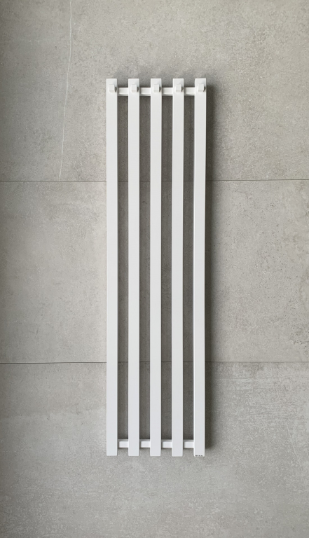 Radiátor s hranatými profily trubek. Radiátor je doplněn v horní části o hranaté háčky pro snadné zavěšení ručníků.