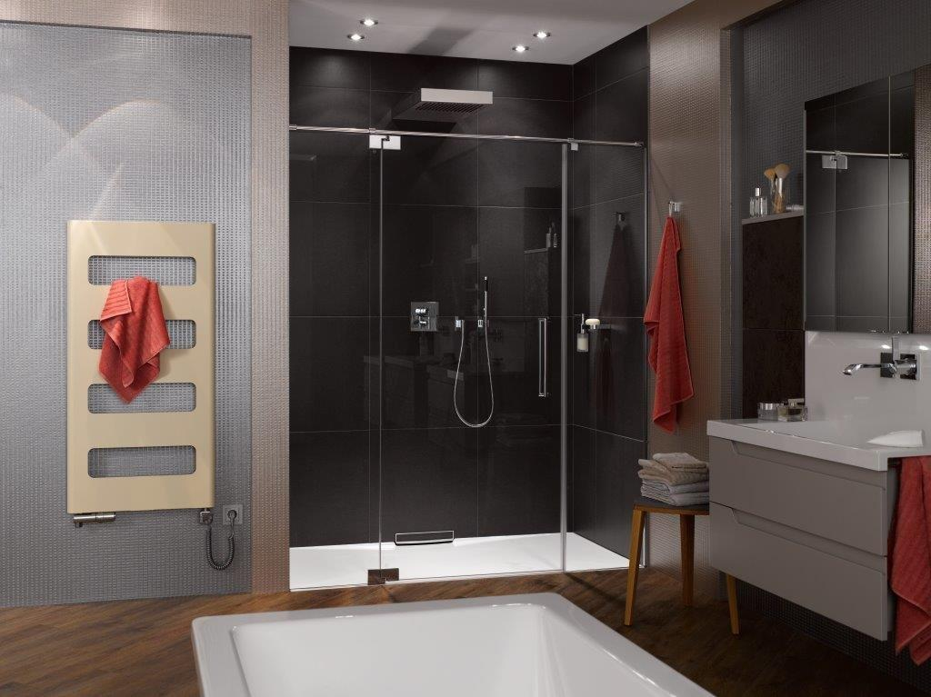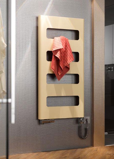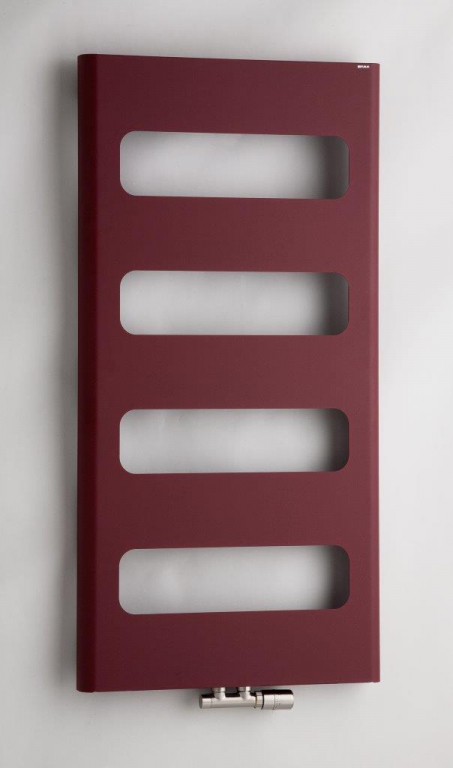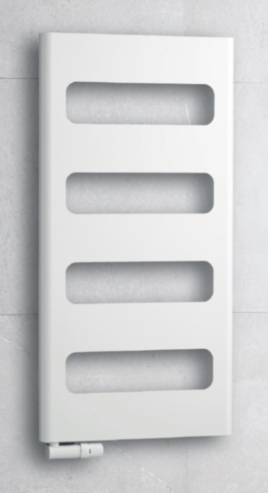 Zaoblená hrana radiátoru do koupelny navozuje vzhled masivního radiátoru.