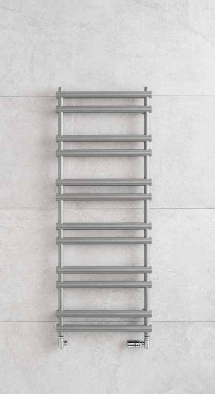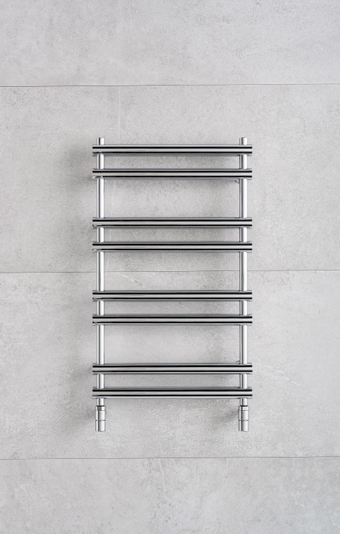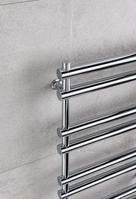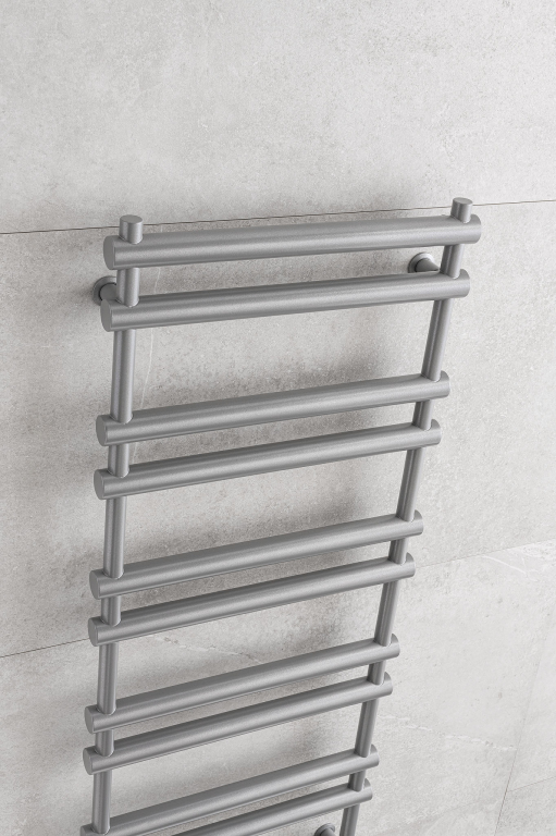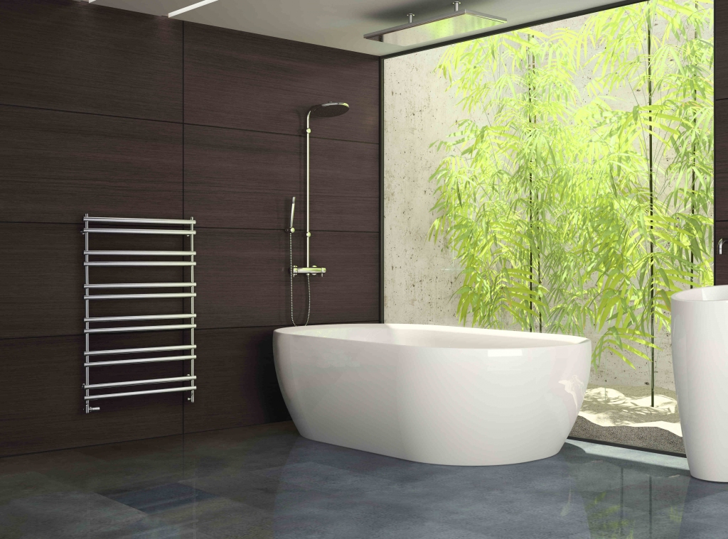 Koupelnový žebřík má důmyslně rozložené příčné trubky, které zcela netradičně přechází skrz svislé boční profily.
