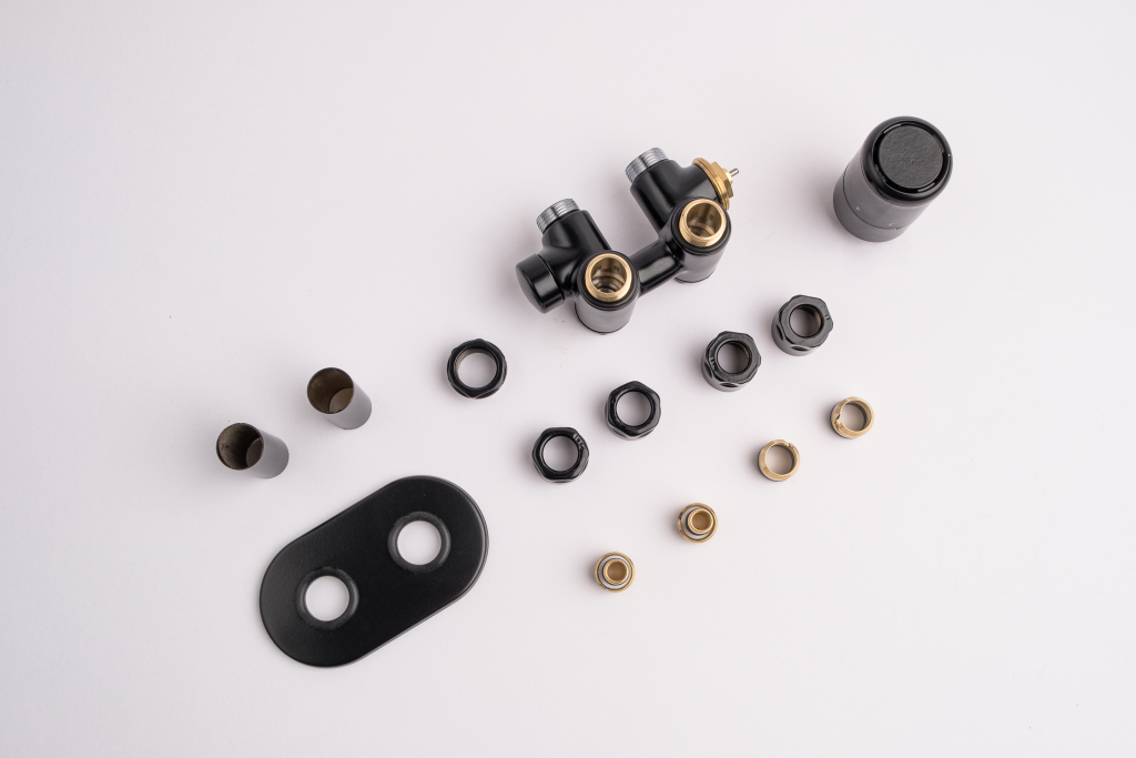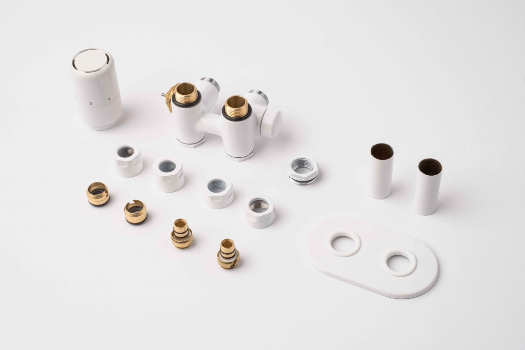 Kompletná sada okrem ventilu obsahuje aj krycie rozety a svorné šróbenie na pripojenie na meď 15 mm a Alupex 16 mm.